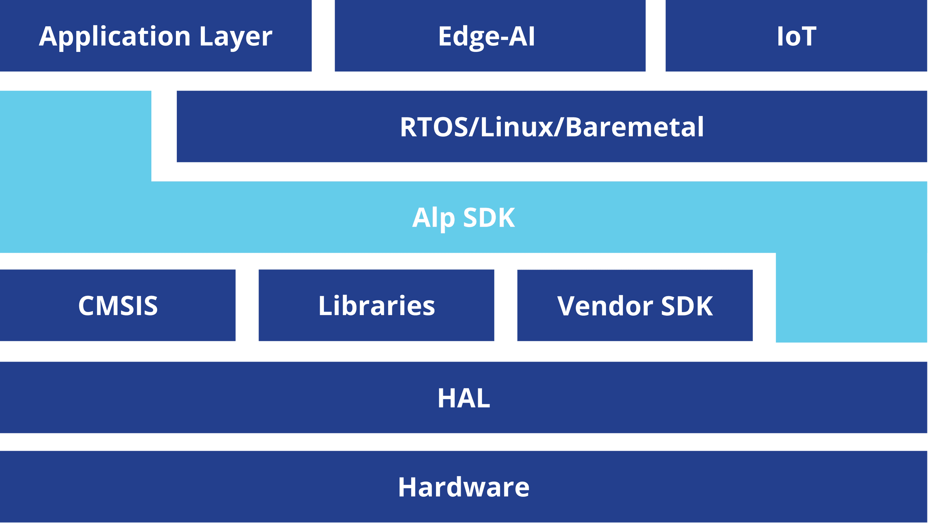 Alp SDK is an open-source, CMSIS-compliant platform that streamlines development with seamless hardware integration across multiple vendors, enabling effortless hardware changes using the same user code. It simplifies secure connectivity, real-time monitoring, and efficient AI deployment—eliminating the need to manage vendor SDKs and libraries.